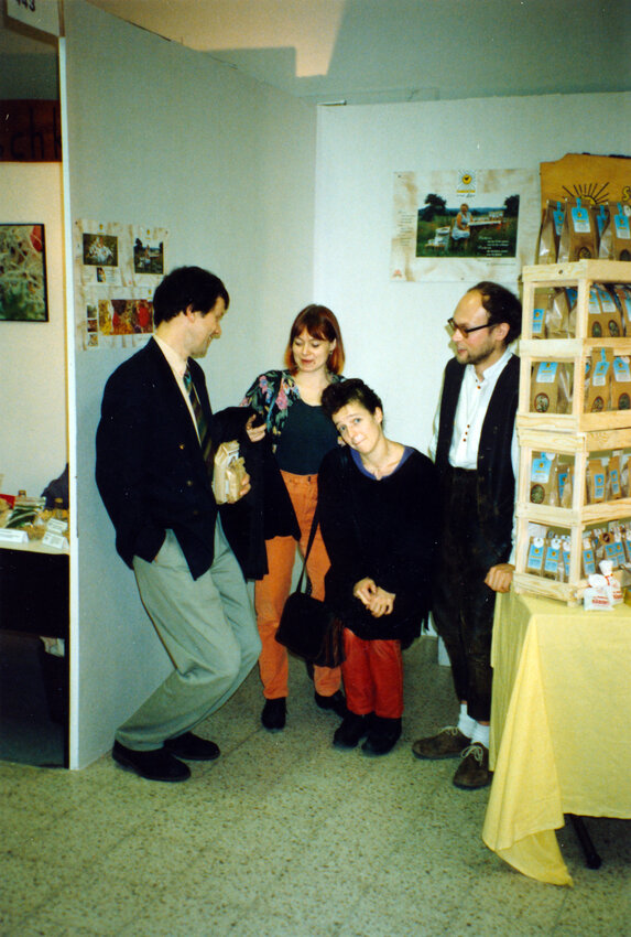 „Aber nein, Herr Inspektor – die stelle ich aus! Auf einer Fachmesse für Naturkost und Naturwaren. Dafür komme ich extra aus Niederösterreich, aus dem Waldviertel!“ erklärt SONNENTOR Gründer Johannes Gutmann begeistert. So recht überzeugt ist der strenge Herr zwar nicht, aber er winkt Hannes schließlich durch und der kommt doch noch rechtzeitig in Mannheim an, um den ersten SONNENTOR Messestand auf der zweiten Ausgabe der Biofach aufzubauen: Auf 9 Quadratmetern (kleinere Flächen gibt es nicht zu mieten) packt Johannes Gutmann seinen kleinen Holzaufsteller die inkriminierten Kräuter-Produktmuster aus. Ware hat er natürlich auch mit: ganze 30 Packerl Tee. Die komplette Ausstattung findet Platz in einem Bananenkarton und der einzige Mitarbeiter ist bereits vor Ort – denn das ist Hannes selbst.